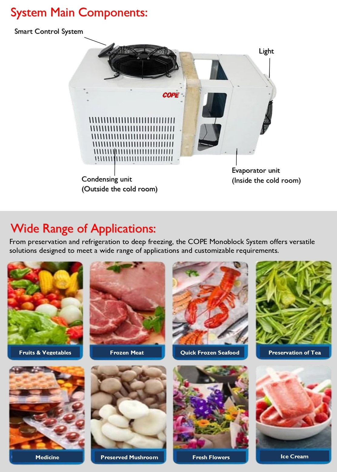 The COPE Monoblock Refrigerant Unit is a revolutionary all-in-one solution designed for freezer and cold room applications. Unlike traditional condensing systems, this compact unit integrates both the evaporator and condenser into a single body, eliminating the need for external condenser installations. This not only simplifies the setup process but also significantly reduces installation time and labor costs.